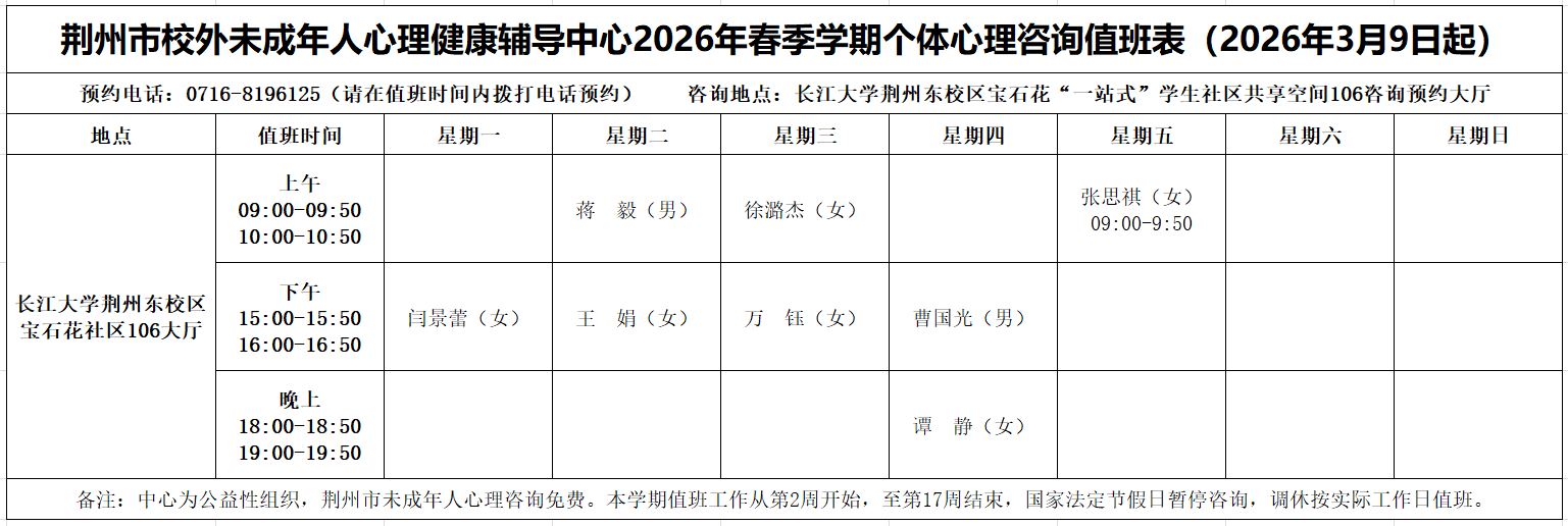 【咨询预约】荆州市校外未成年人心理健康辅导中心:2026年春季学期心理咨询值班表