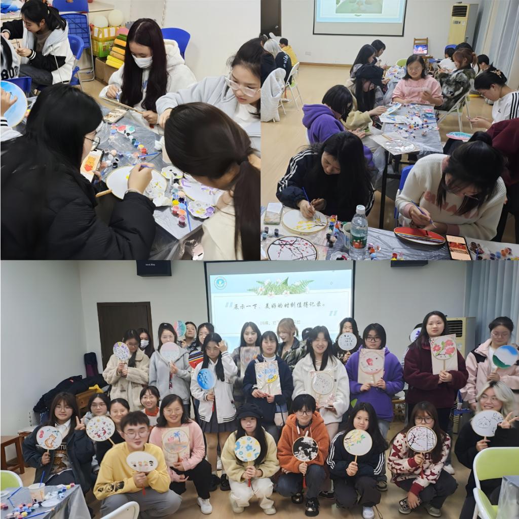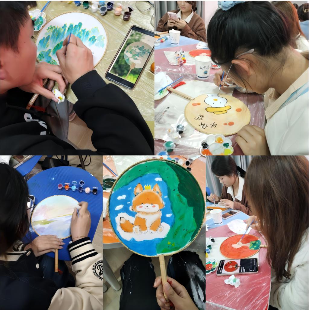 伴随着轻松的音乐,同学们纷纷拿起手中的画笔,开始在洁白的扇面上创作。随着每一次笔触的落下,缤纷的颜料碰撞在一起,擦出了奇妙的火花。同学们将内心的情感浇注于此,使原本静默的扇子“舞动”了起来,更实现了自我疗愈。