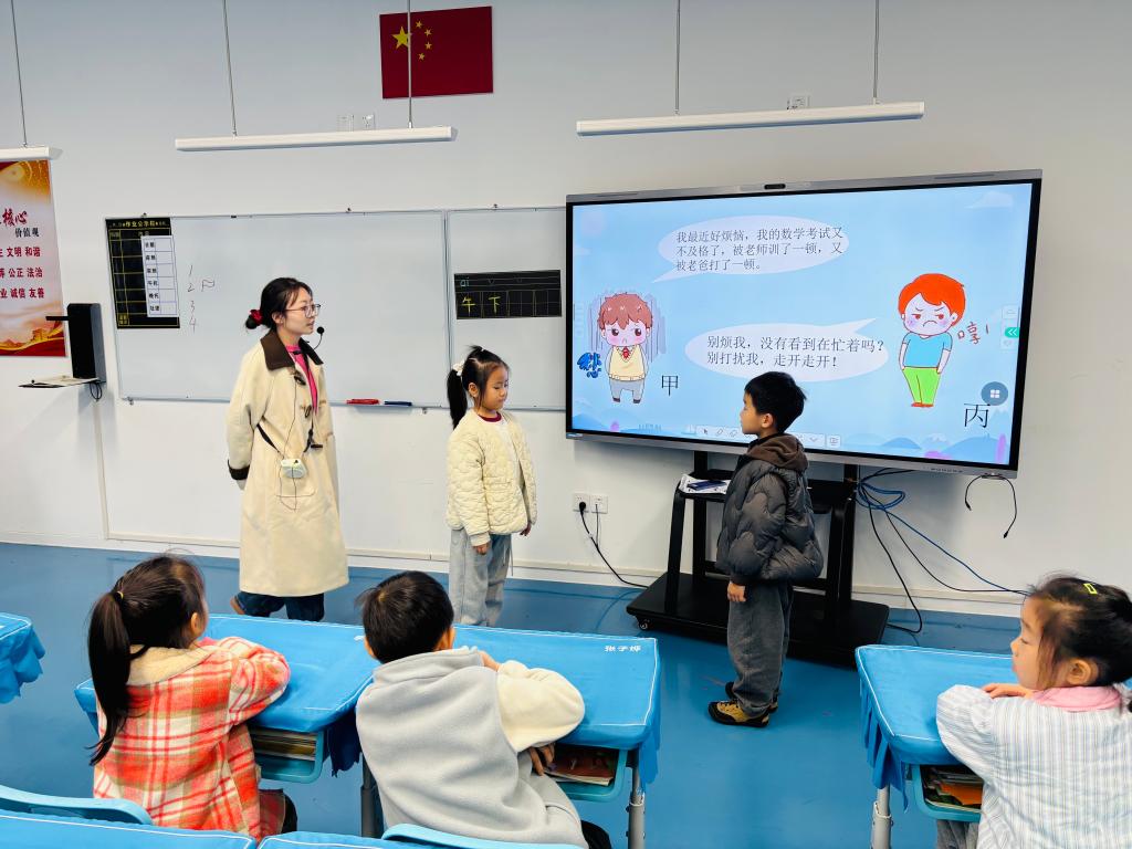 进入“情境微剧场”环节,自告奋勇的四位同学登台扮演角色。面对甲同学“我最近特别烦恼”的倾诉,乙、丙、丁三人给出了截然不同的回应。有人不发一言却辅以尴尬的微笑,有人高喊着“别打扰我,我也很忙”,还有人胡乱猜测对方情绪不好的原因。“面对迥异的回复,你的感受如何?你希望大家用怎样的语气和态度交流呢?”管师师老师陪伴同学们认真思考,并学习一些人际交往的技巧,告诉大家在与他人沟通时,一定要保持个人语气平和,同时注意耐心倾听。